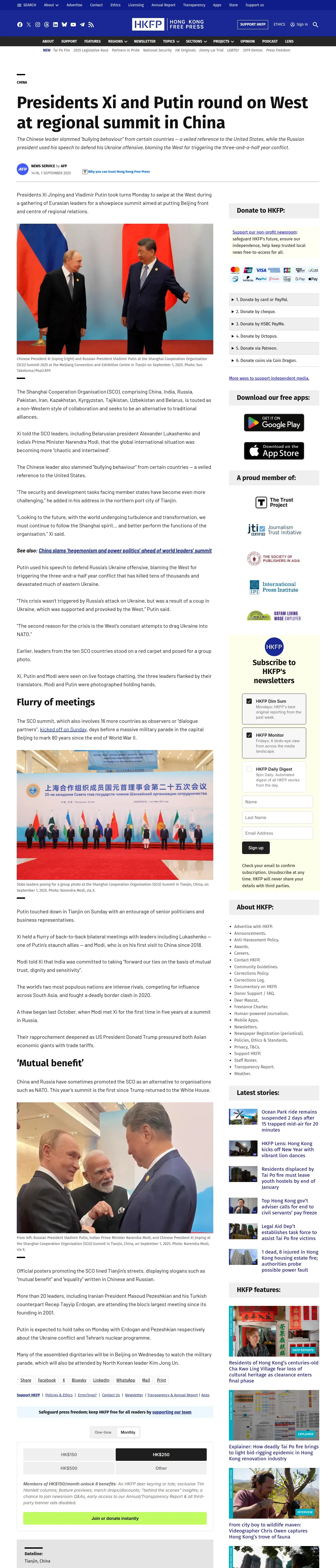 https://hongkongfp.com:443/2025/09/01/presidents-xi-and-putin-round-on-west-at-regional-summit-in-china/