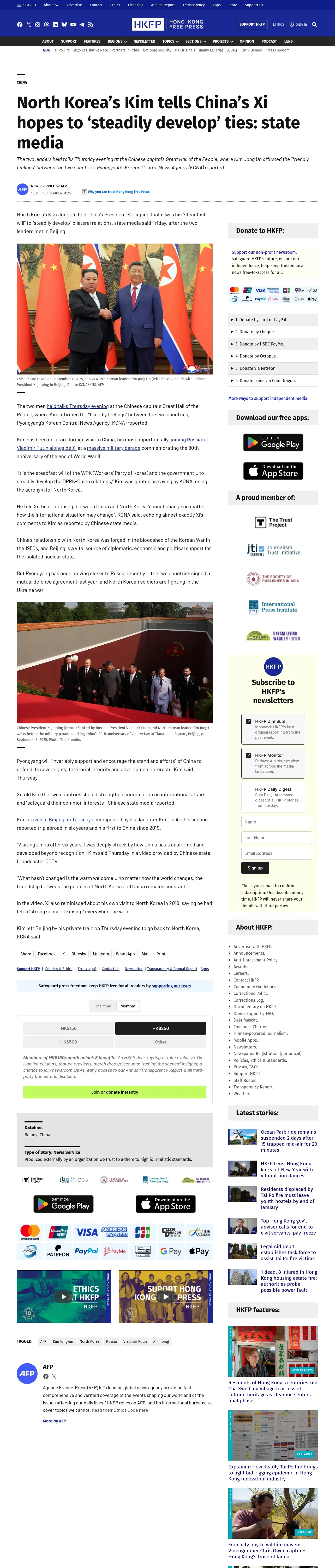 https://hongkongfp.com:443/2025/09/05/north-koreas-kim-tells-chinas-xi-hopes-to-steadily-develop-ties-state-media/