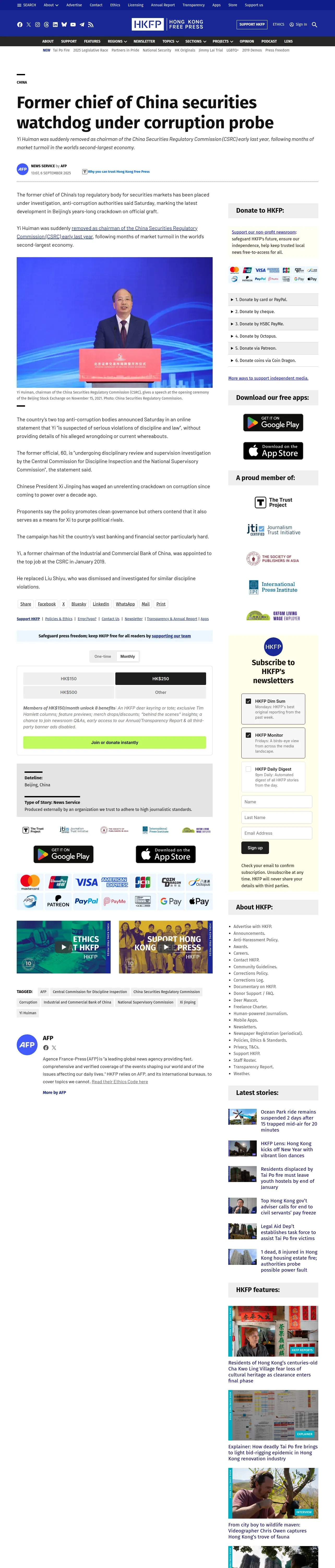https://hongkongfp.com:443/2025/09/06/former-chief-of-china-securities-watchdog-under-corruption-probe/