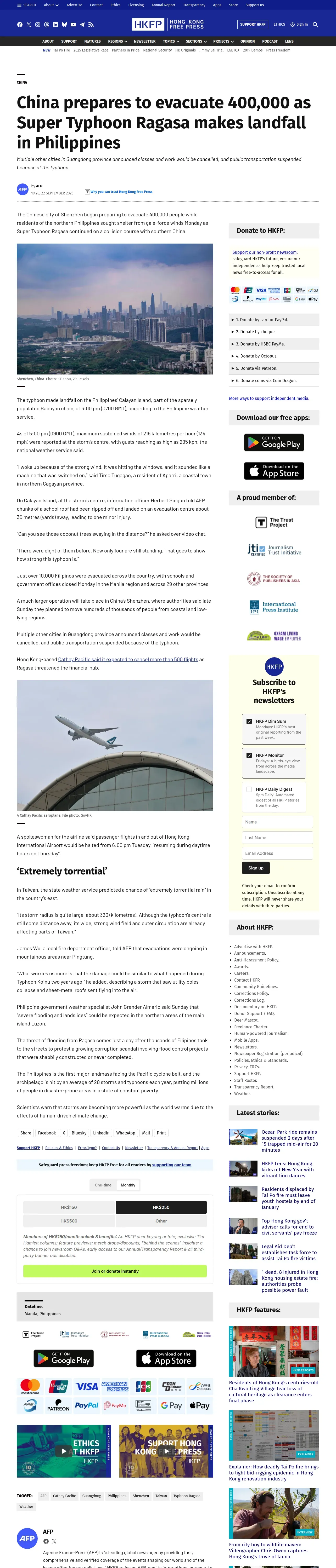 取得元URL: https://hongkongfp.com:443/2025/09/22/china-prepares-to-evacuate-400000-as-super-typhoon-ragasa-makes-landfall-in-philippines/