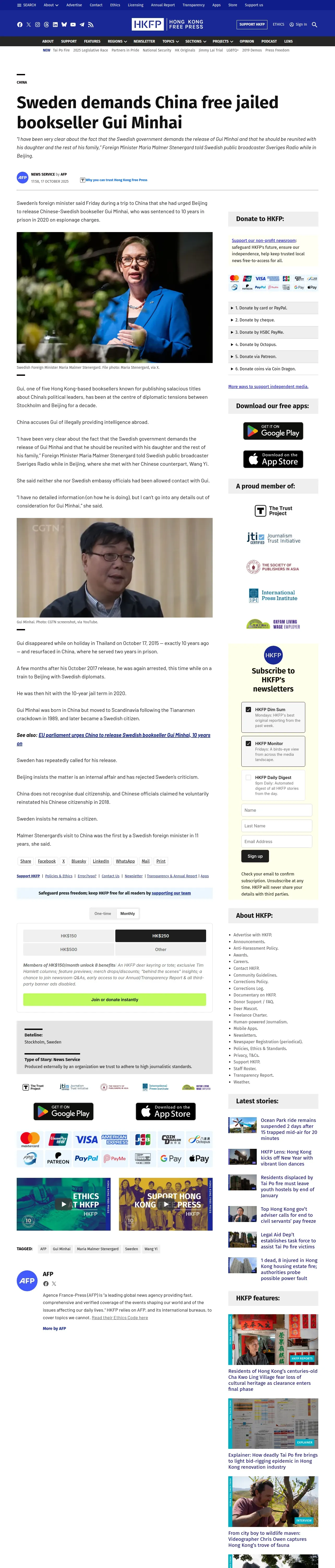 取得元URL: https://hongkongfp.com:443/2025/10/17/sweden-demands-china-free-jailed-bookseller-gui-minhai/