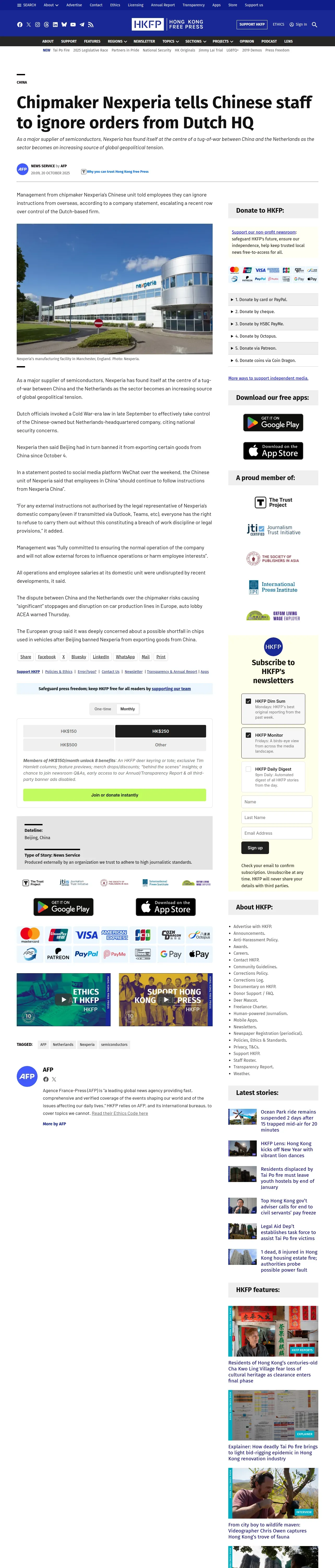 https://hongkongfp.com:443/2025/10/20/chipmaker-nexperia-tells-chinese-staff-to-ignore-orders-from-dutch-hq/
