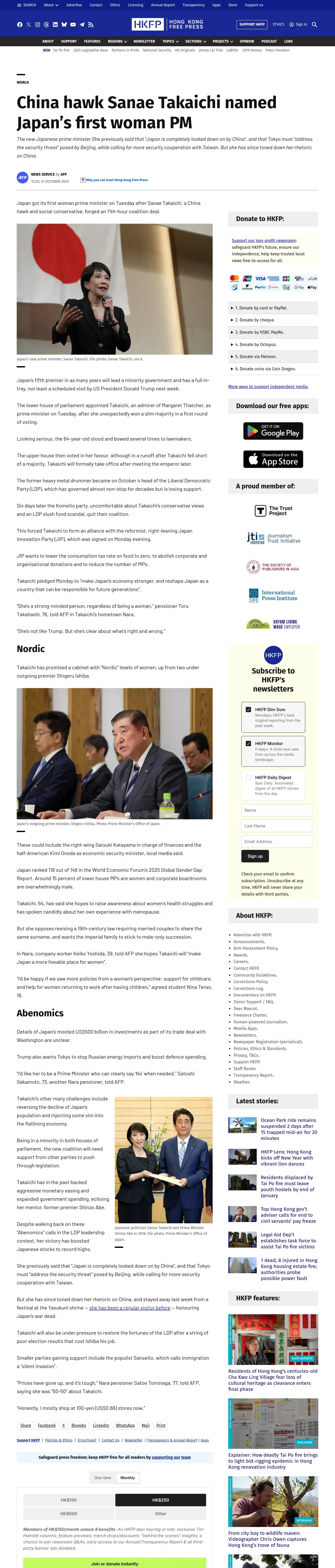 https://hongkongfp.com:443/2025/10/21/china-hawk-sanae-takaichi-named-japans-first-woman-pm/