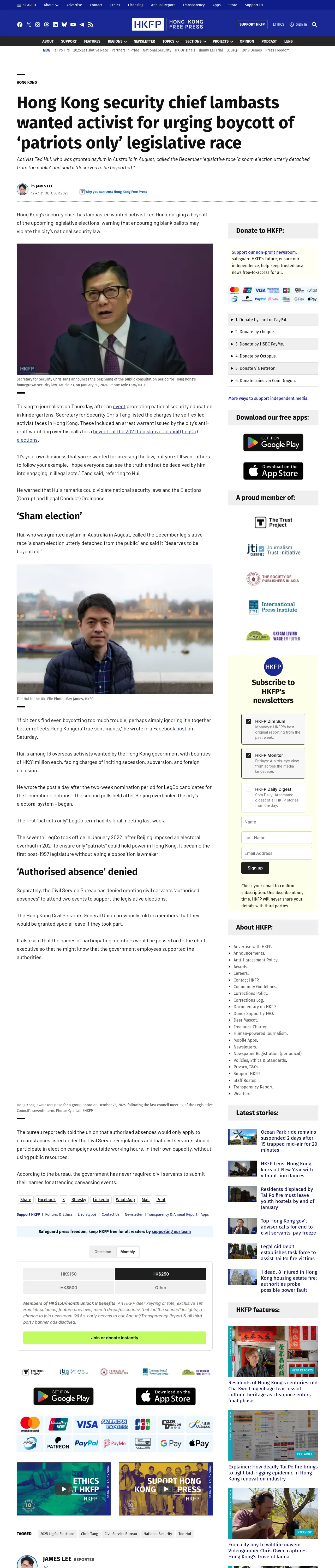 https://hongkongfp.com:443/2025/10/31/hong-kong-security-chief-lambasts-wanted-activist-for-urging-boycott-of-patriots-only-legislative-race/