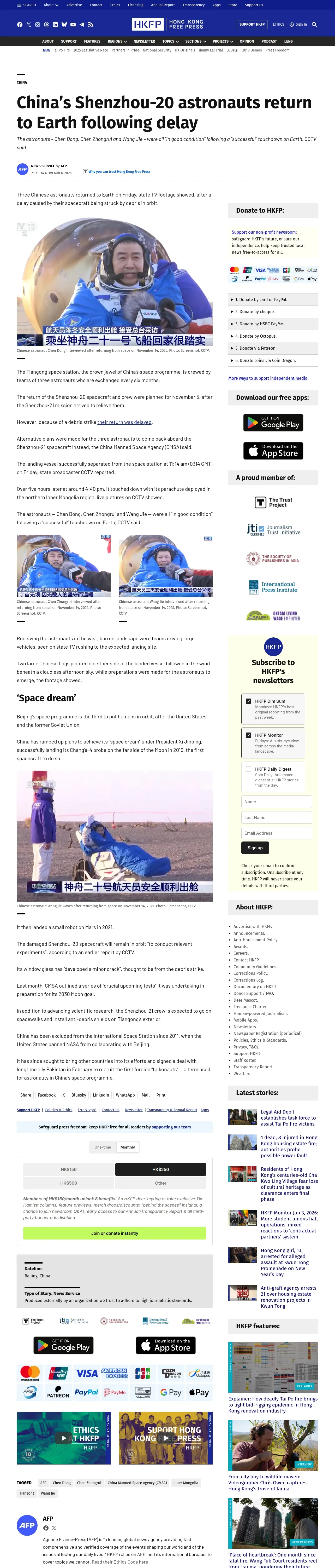 https://hongkongfp.com:443/2025/11/14/chinas-shenzhou-20-astronauts-return-to-earth-following-delay/