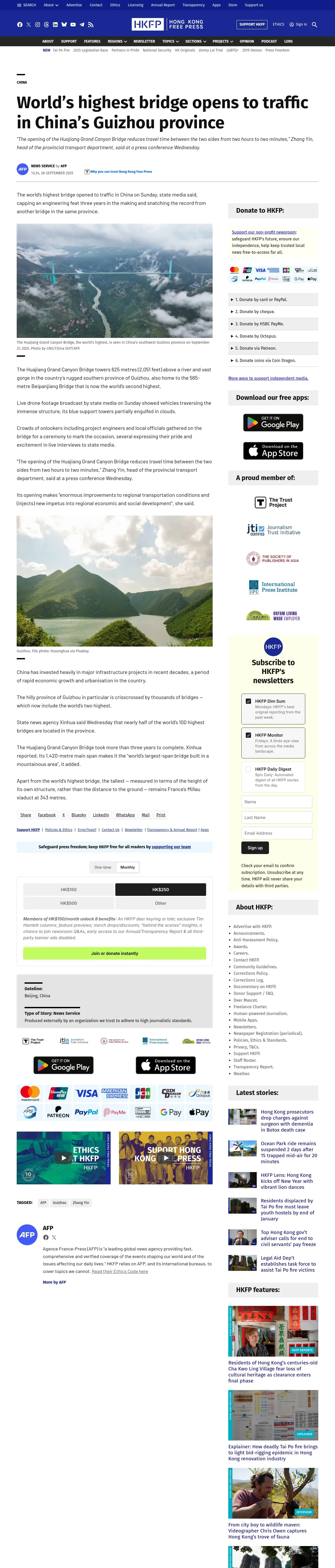 https://hongkongfp.com:443/2025/09/28/worlds-highest-bridge-opens-to-traffic-in-chinas-guizhou-province/