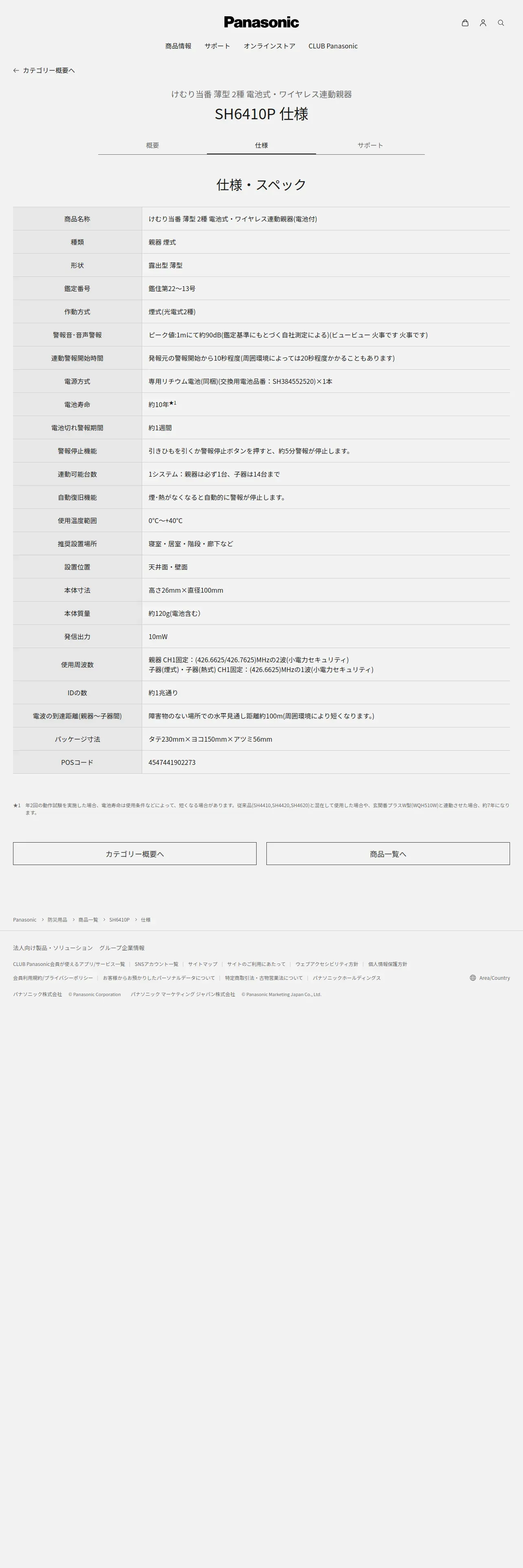 取得元URL: https://panasonic.jp:443/bosai/products/SH6410P/spec.html