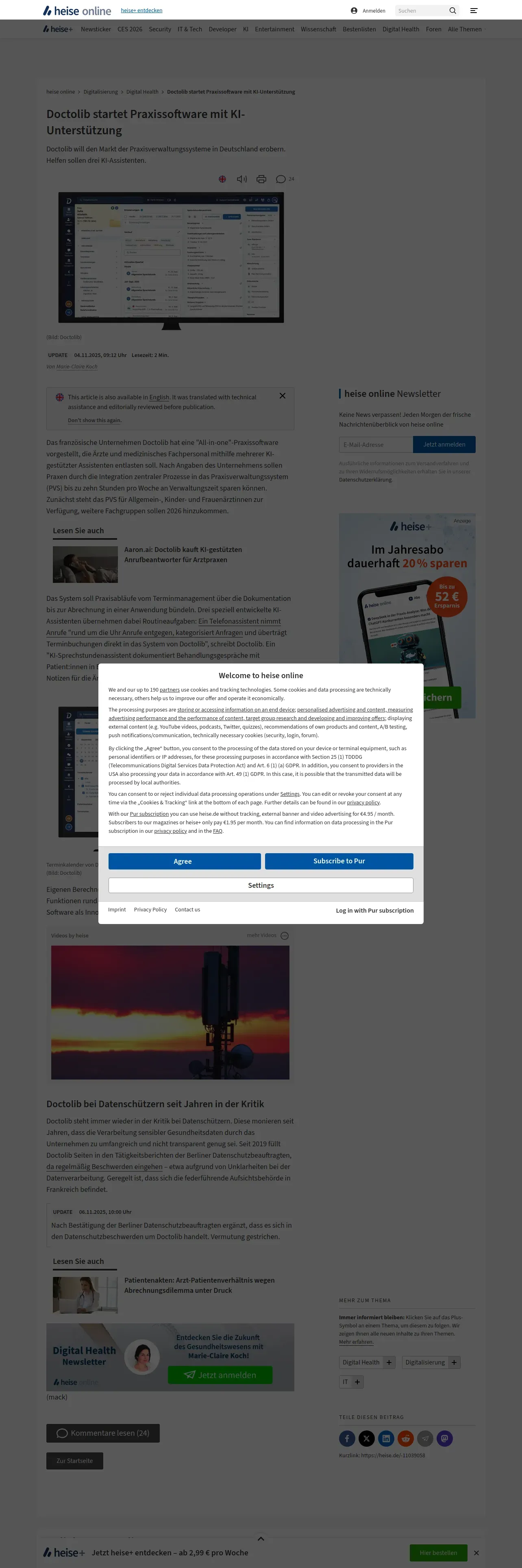 https://www.heise.de:443/news/Doctolib-startet-Praxissoftware-mit-KI-Unterstuetzung-11039058.html
