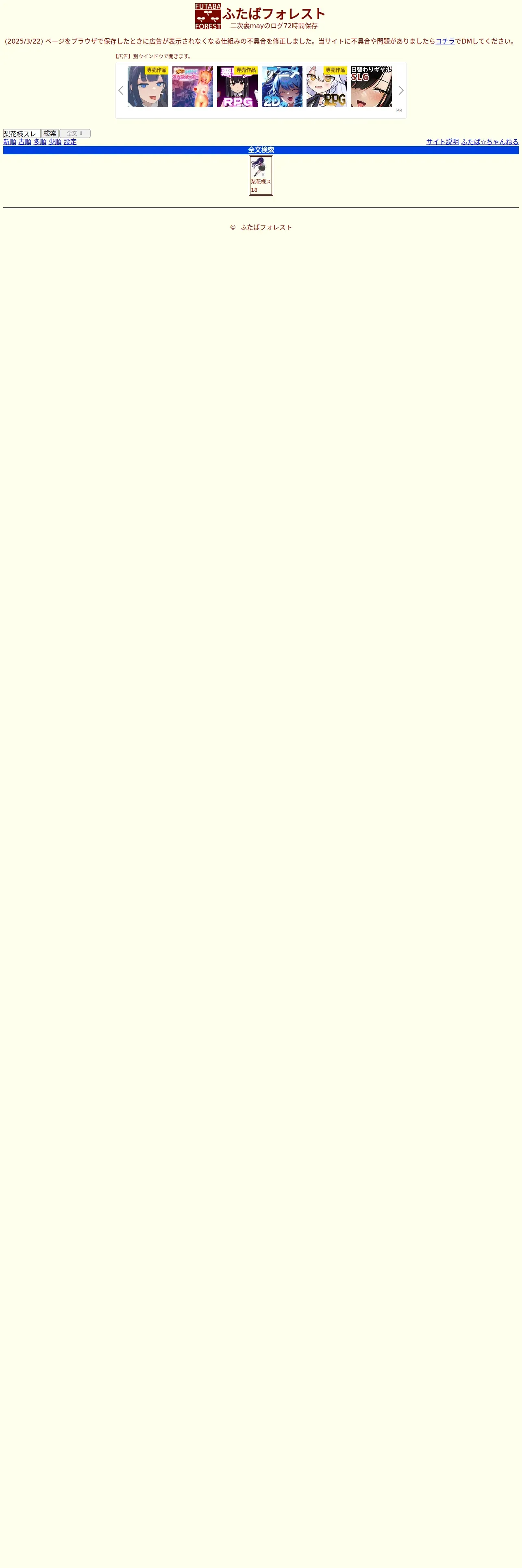 https://futabaforest.net:443/index.htm?sm=2&words=%E6%A2%A8%E8%8A%B1%E6%A7%98%E3%82%B9%E3%83%AC