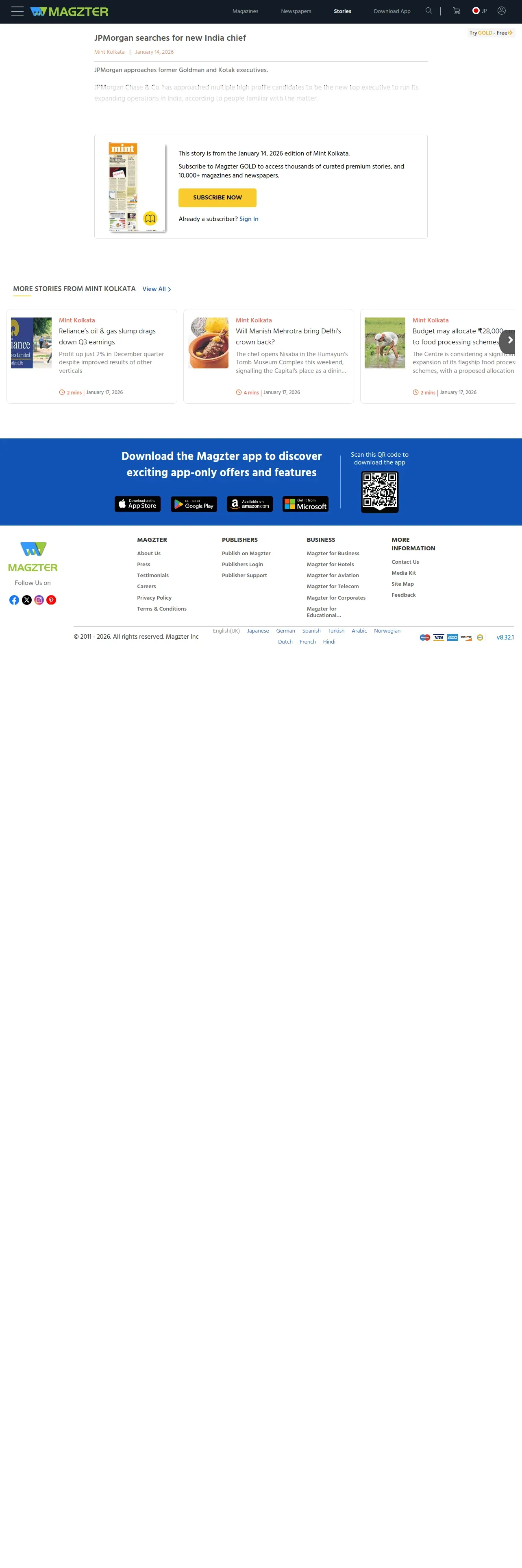 https://www.magzter.com:443/stories/newspaper/Mint-Kolkata/JPMORGAN-SEARCHES-FOR-NEW-INDIA-CHIEF