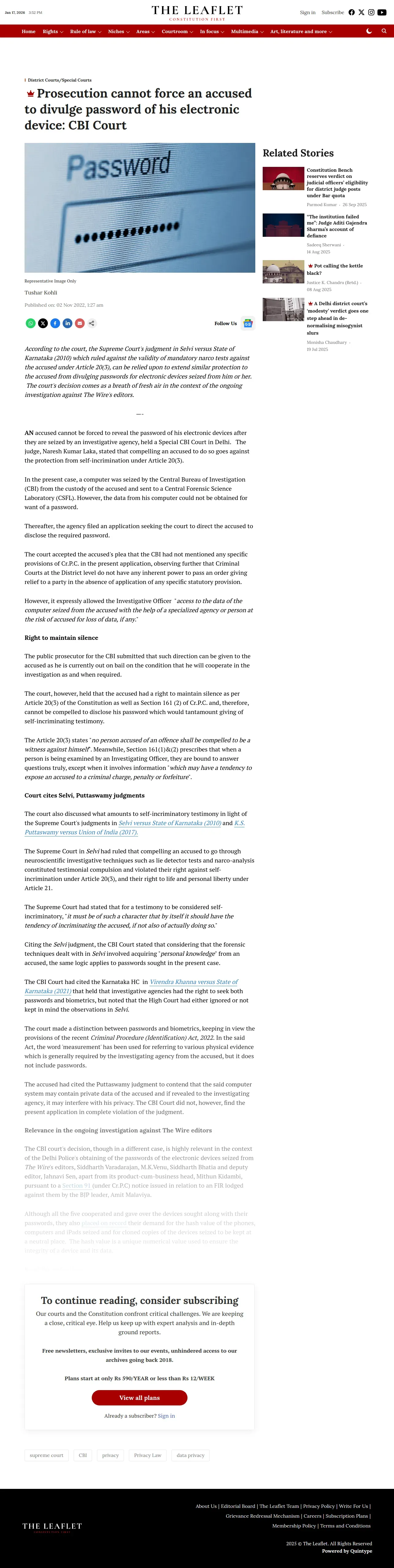https://theleaflet.in:443/district-courts/prosecution-cannot-force-an-accused-to-divulge-password-of-his-electronic-device-cbi-court