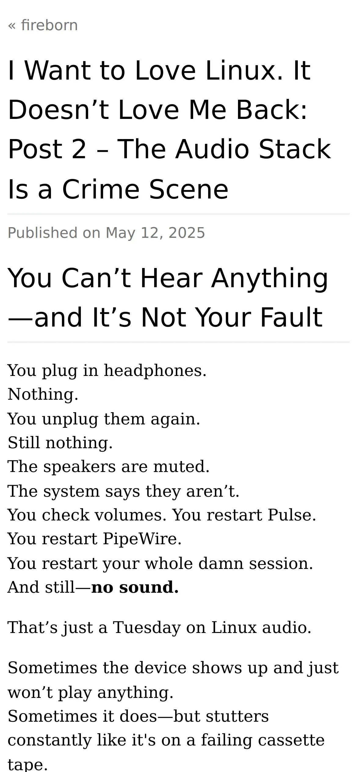 https://fireborn.mataroa.blog:443/blog/i-want-to-love-linux-it-doesnt-love-me-back-post-2-the-audio-stack-is-a-crime-scene/