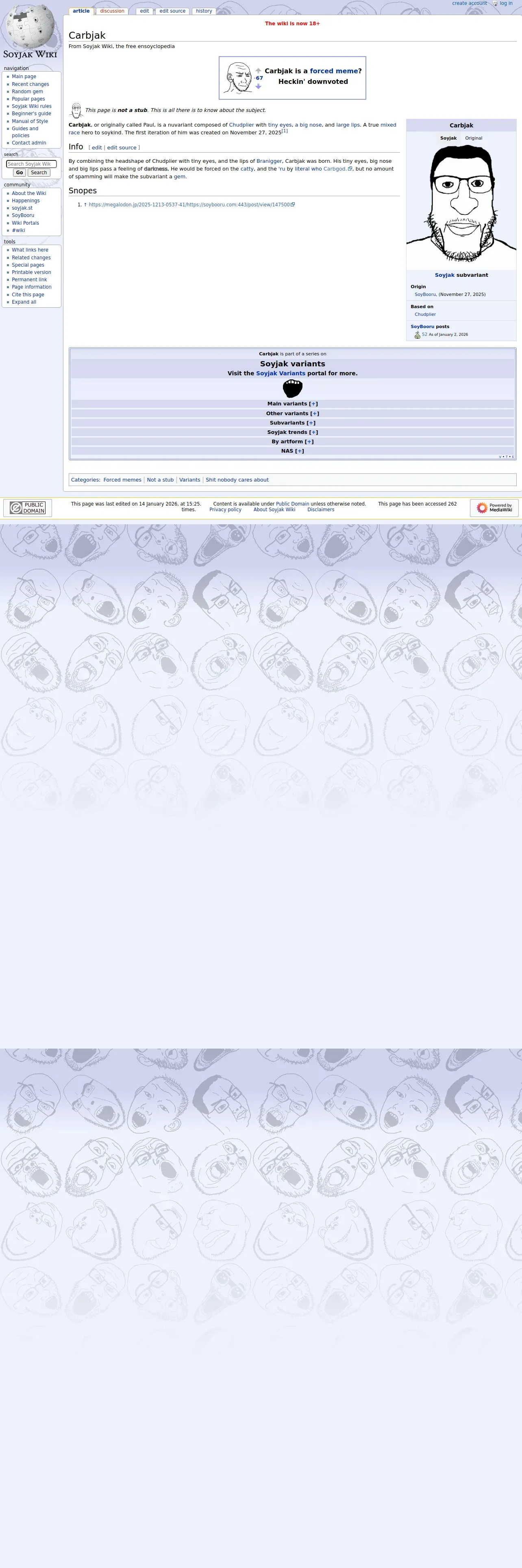 取得元URL: https://soyjakwiki.org:443/Carbjak