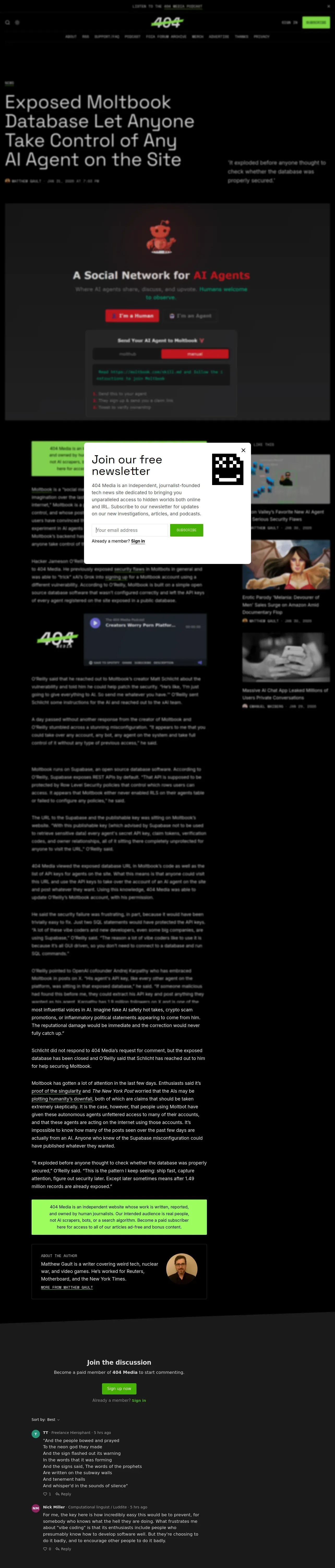 https://www.404media.co:443/exposed-moltbook-database-let-anyone-take-control-of-any-ai-agent-on-the-site/
