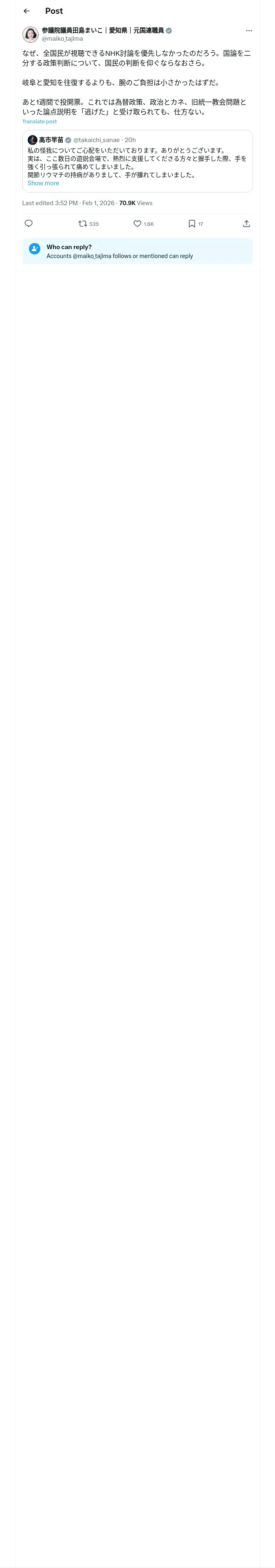 取得元URL: https://x.com:443/maiko_tajima/status/2017853654376546443