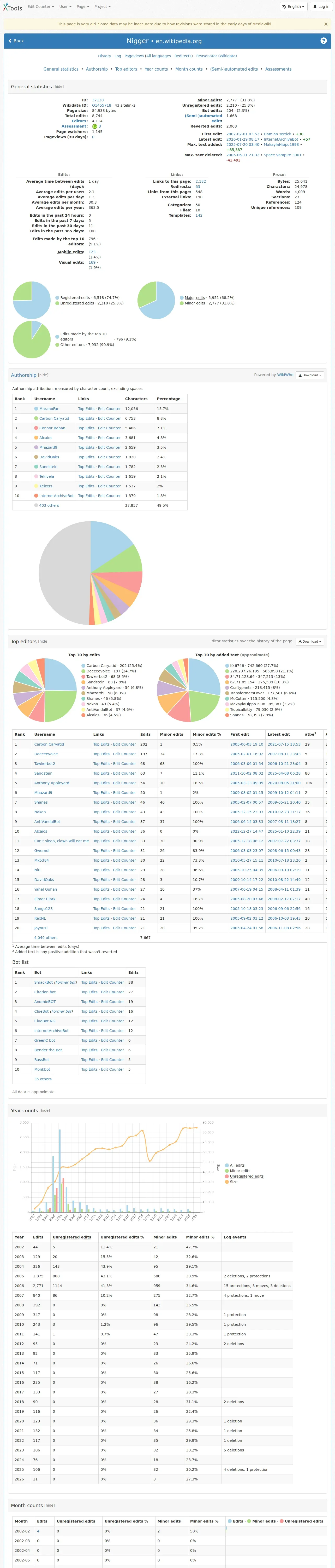 取得元URL: https://xtools.wmcloud.org:443/articleinfo/en.wikipedia.org/Nigger