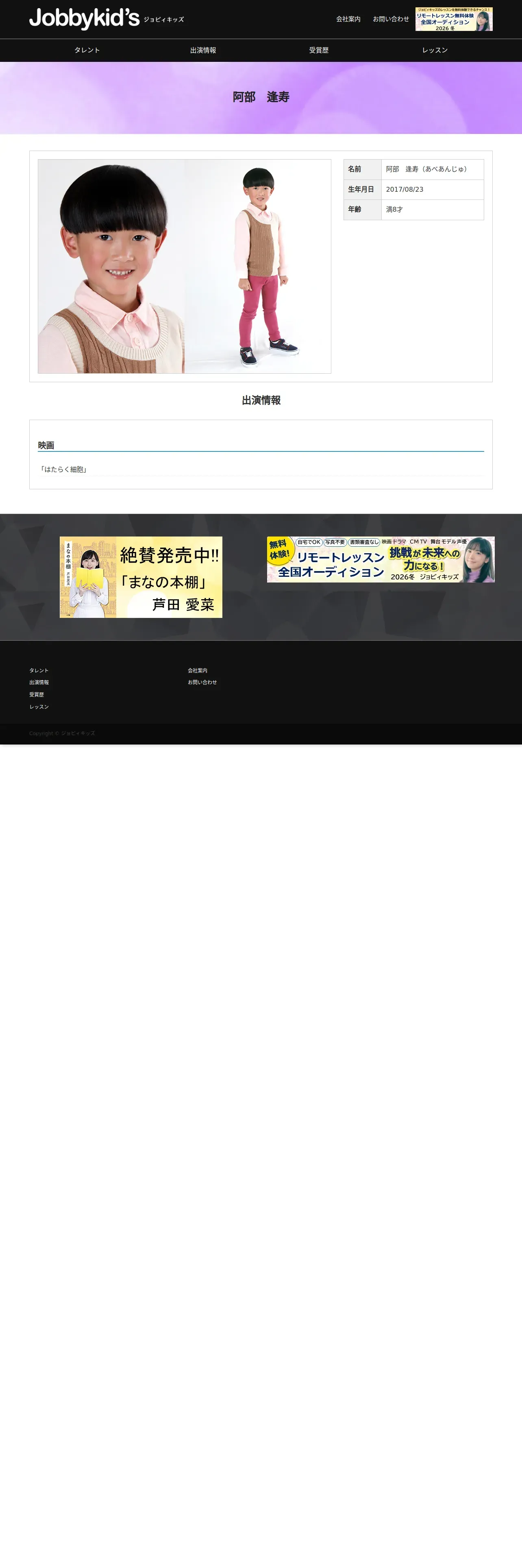 https://www.jobbykids.jp:443/talent/%e9%98%bf%e9%83%a8%e9%80%a2%e5%af%bf/