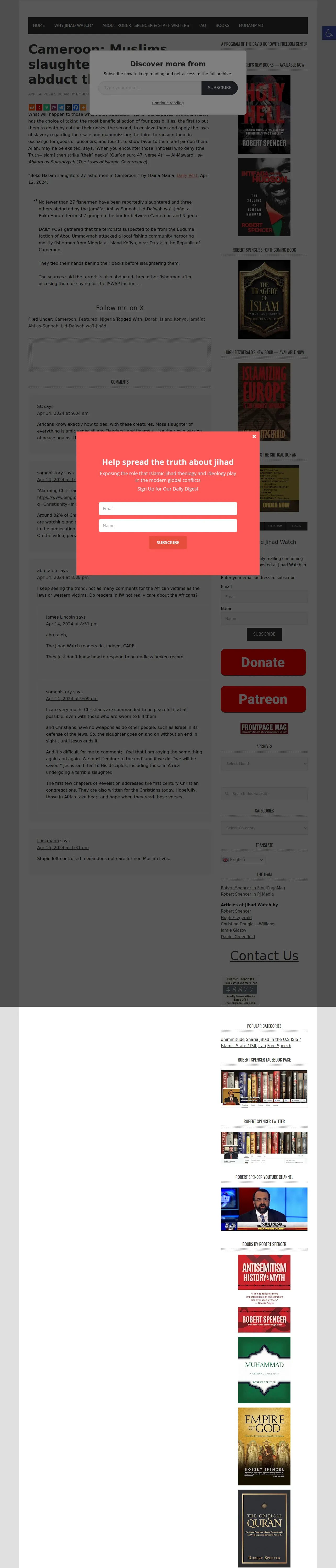 https://jihadwatch.org:443/2024/04/cameroon-muslims-slaughter-27-fisherman-abduct-three-others