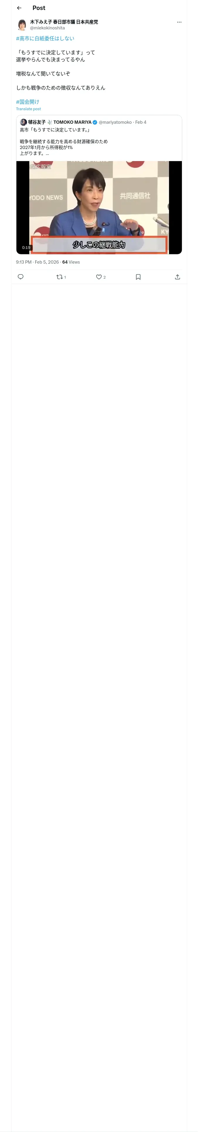 取得元URL: https://x.com:443/miekokinoshita/status/2019383875647189096