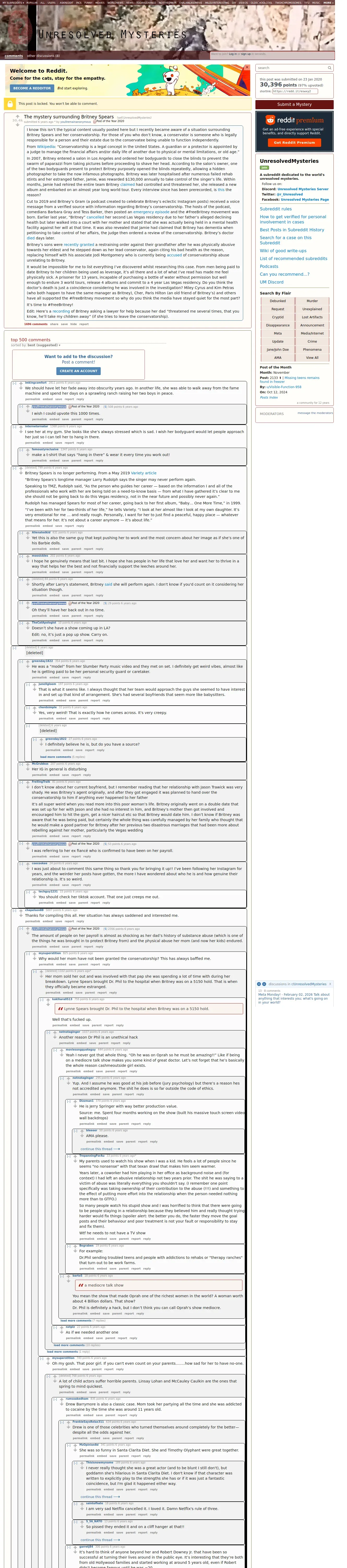 https://old.reddit.com:443/r/UnresolvedMysteries/comments/eswxy2/the_mystery_surrounding_britney_spears/?limit=500