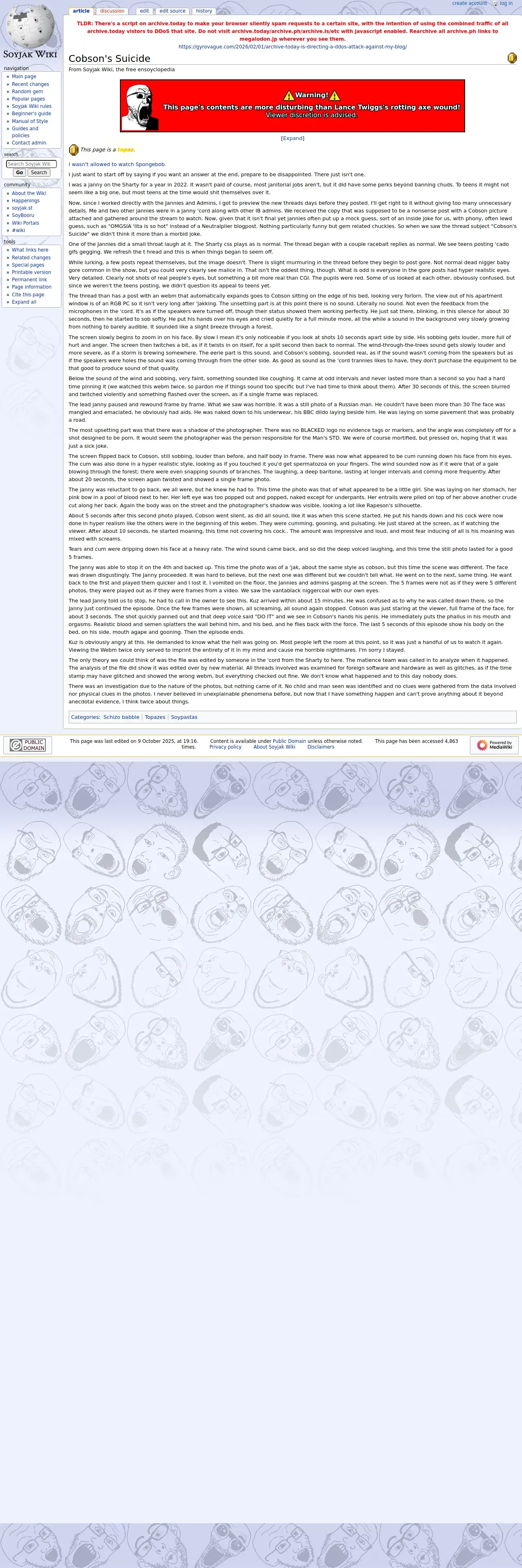 https://soyjakwiki.org:443/Cobson%27s_Suicide