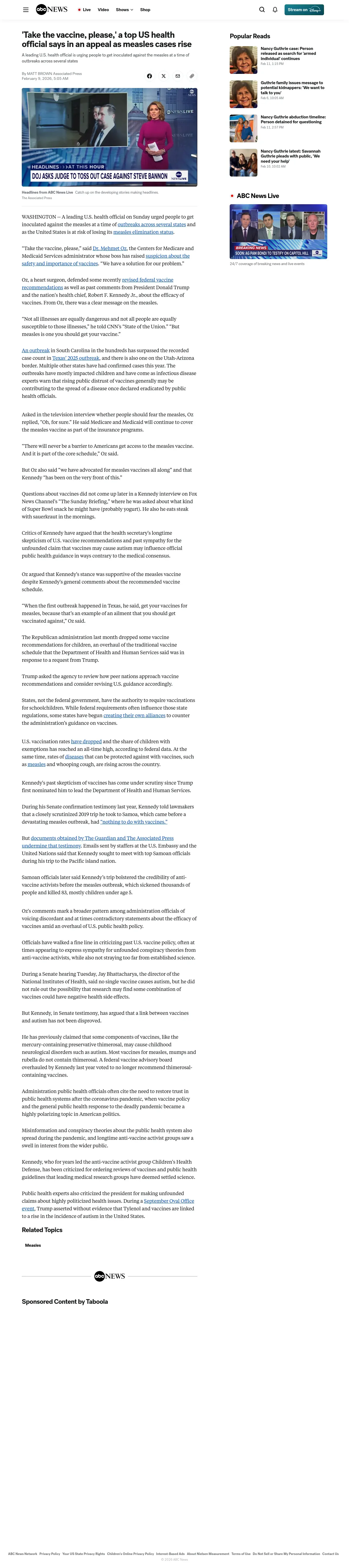 https://abcnews.com:443/Health/wireStory/vaccine-top-us-health-official-appeal-measles-cases-129972374