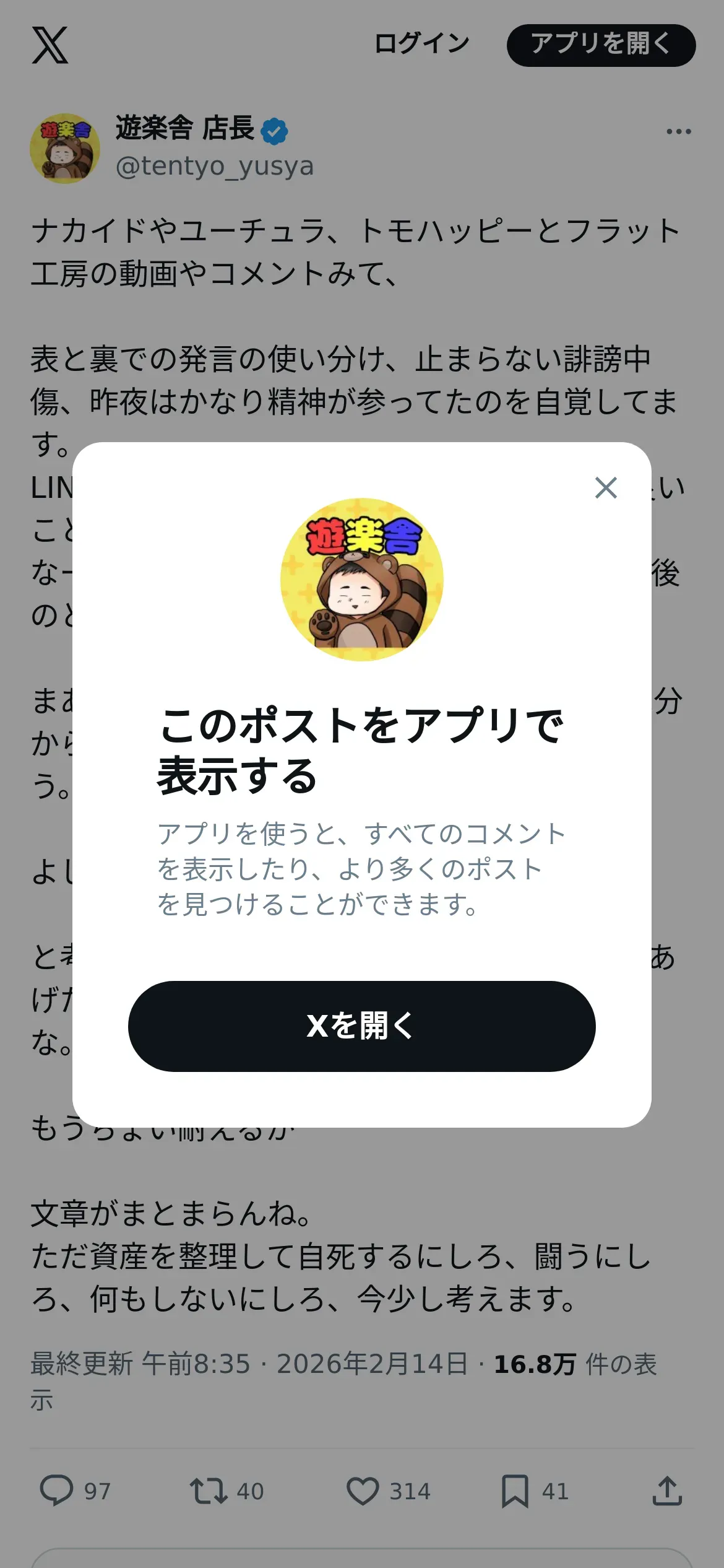 https://x.com:443/tentyo_yusya/status/2022454580899172515