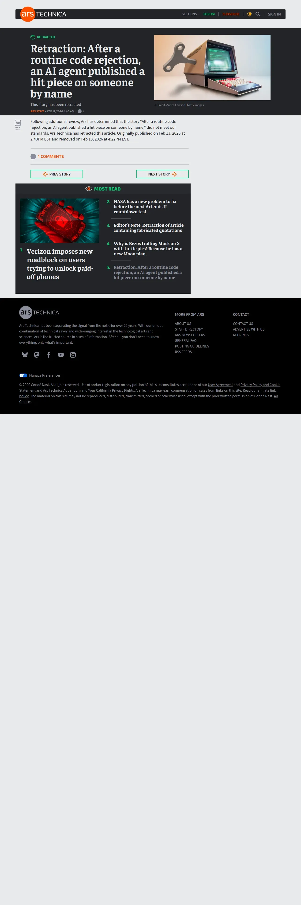 https://arstechnica.com:443/ai/2026/02/after-a-routine-code-rejection-an-ai-agent-published-a-hit-piece-on-someone-by-name/