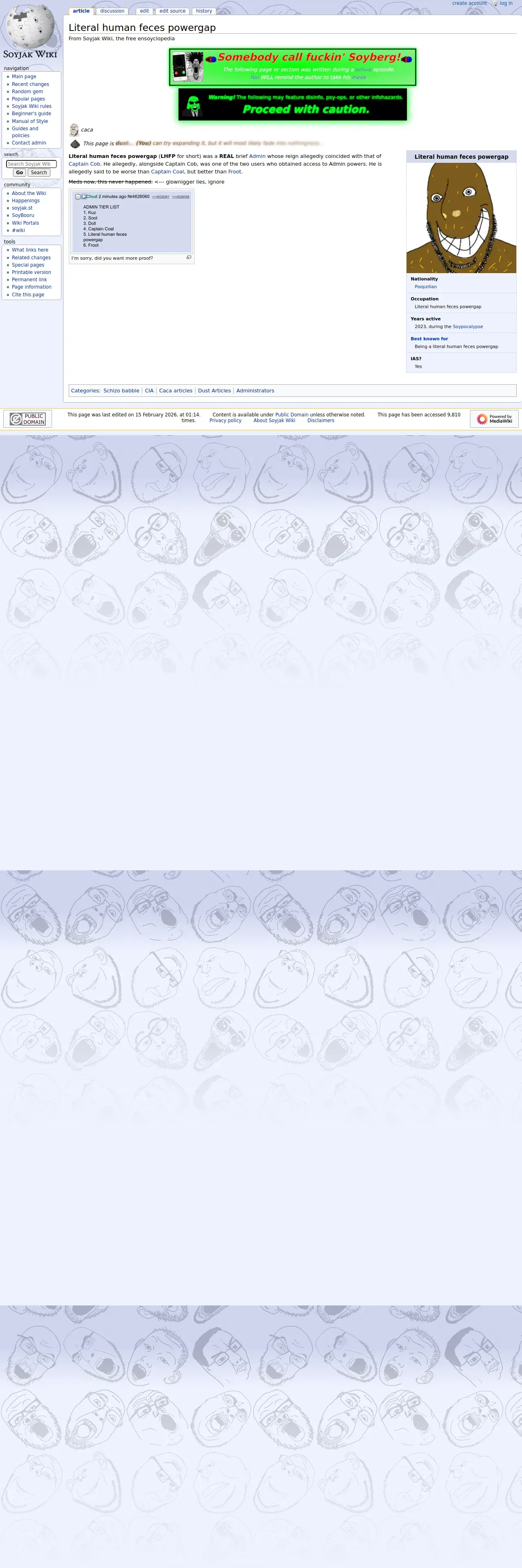 https://soyjakwiki.org:443/Literal_human_feces_powergap