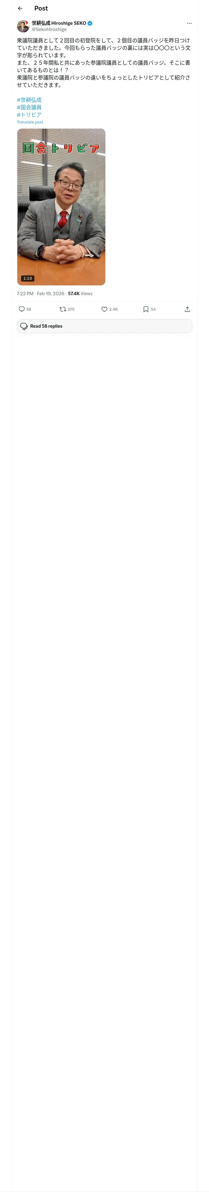 https://x.com:443/SekoHiroshige/status/2024429320610205838