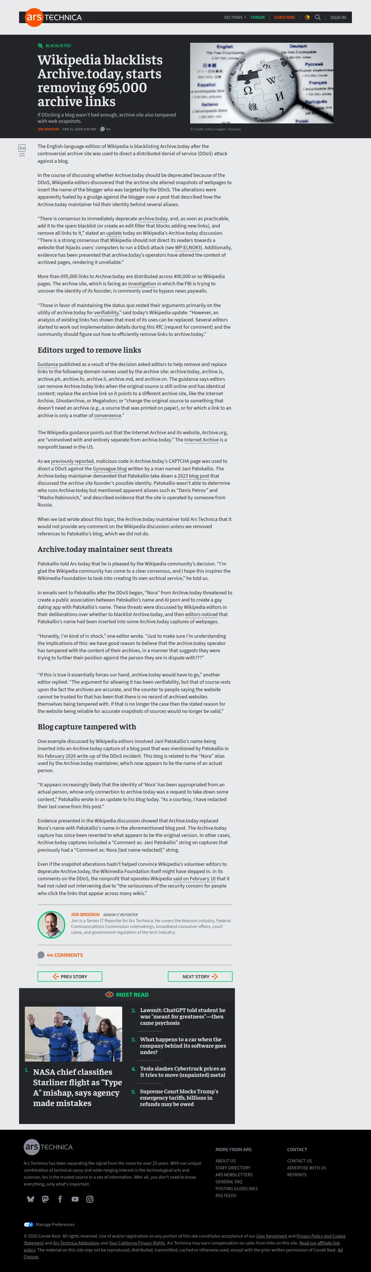 https://arstechnica.com:443/tech-policy/2026/02/wikipedia-bans-archive-today-after-site-executed-ddos-and-altered-web-captures/