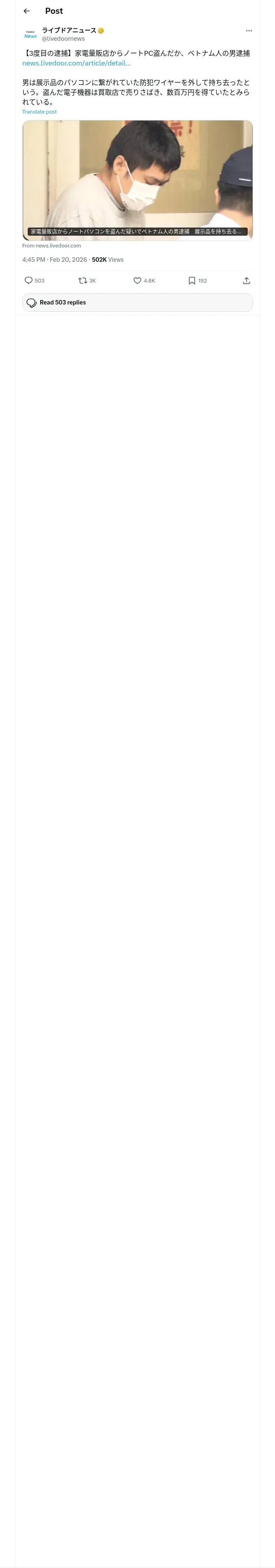https://x.com:443/livedoornews/status/2024752129110343838