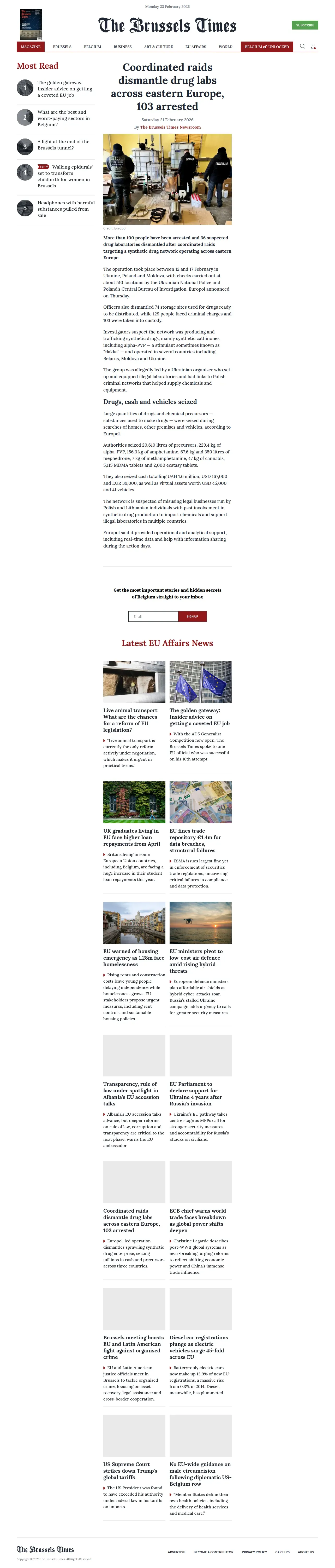 https://www.brusselstimes.com:443/1983296/coordinated-raids-dismantle-drug-labs-across-eastern-europe-103-arrested