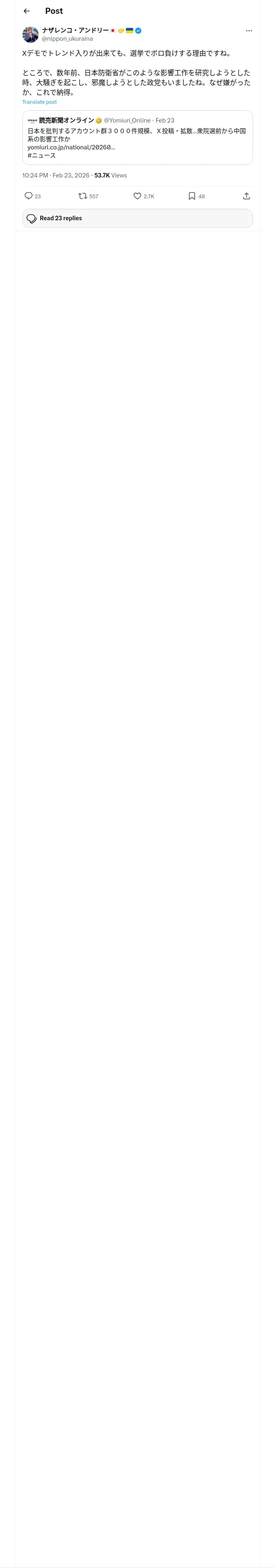 取得元URL: https://x.com:443/nippon_ukuraina/status/2025924748845441419