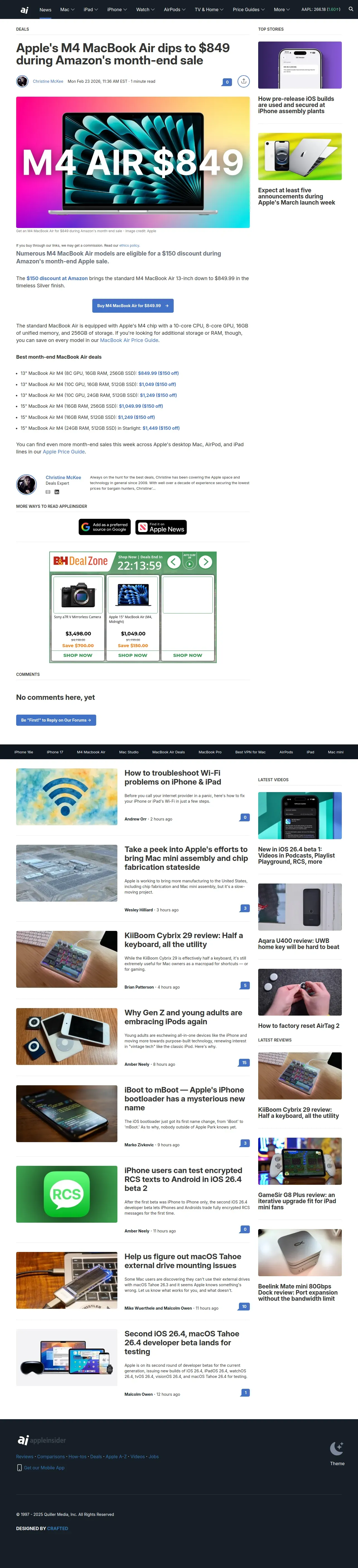 https://appleinsider.com:443/articles/26/02/23/apples-m4-macbook-air-dips-to-849-during-amazons-month-end-sale