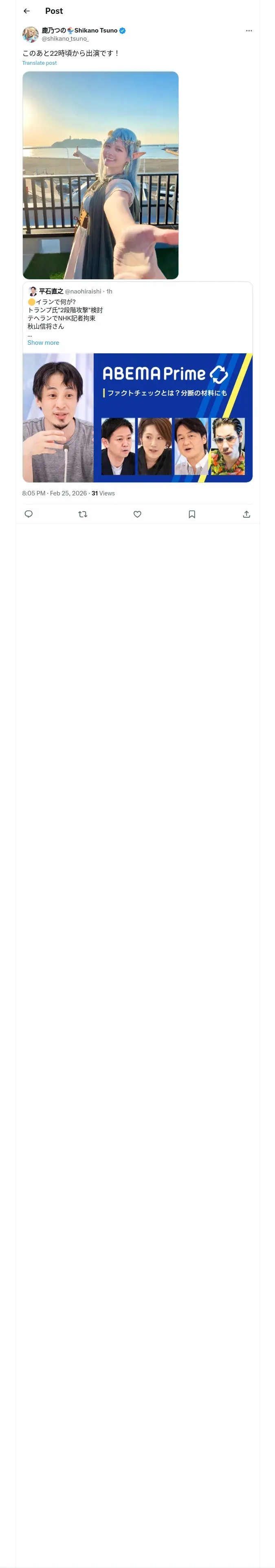 取得元URL: https://x.com:443/shikano_tsuno_/status/2026614489546895628