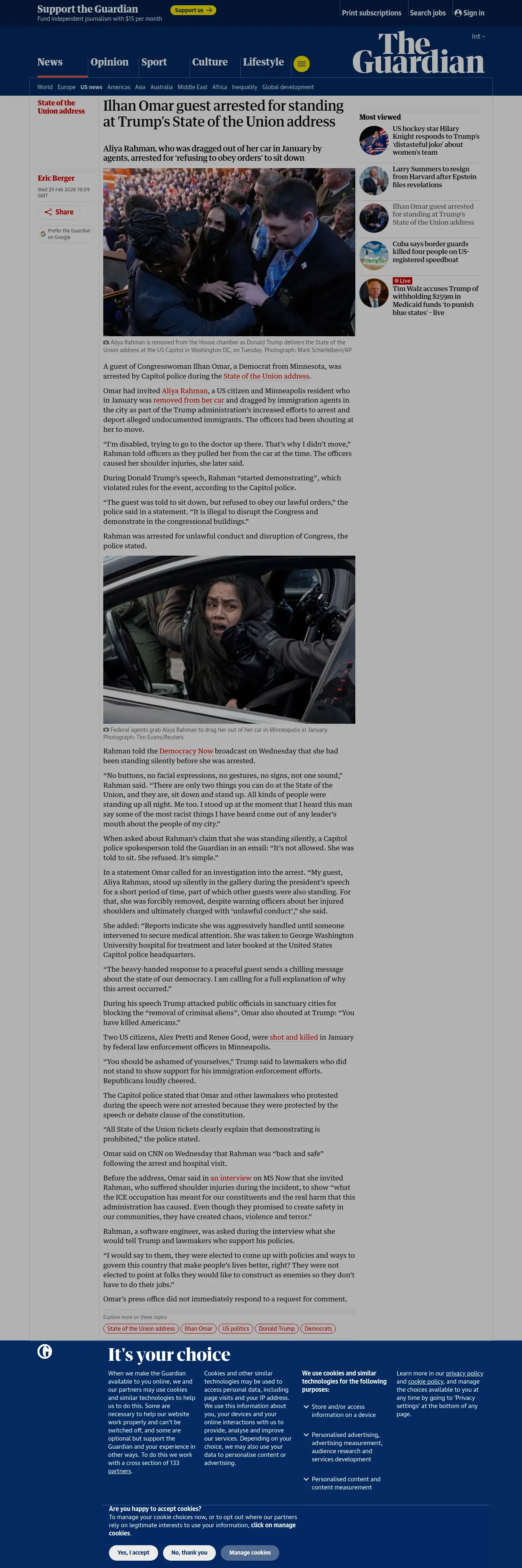 https://www.theguardian.com:443/us-news/2026/feb/25/ilhan-omar-guest-arrested-state-union