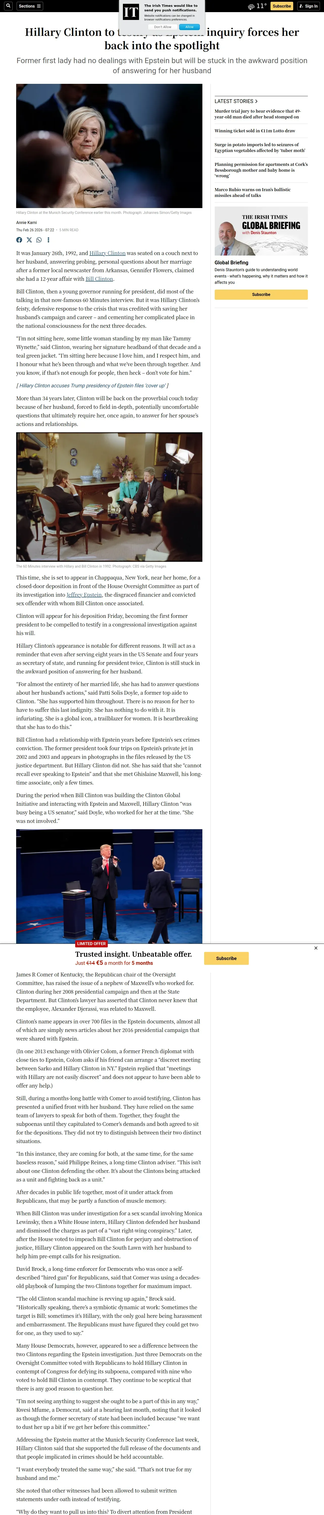 取得元URL: https://www.irishtimes.com:443/world/us/2026/02/26/hillary-clinton-to-testify-as-epstein-inquiry-forces-her-back-into-the-spotlight/