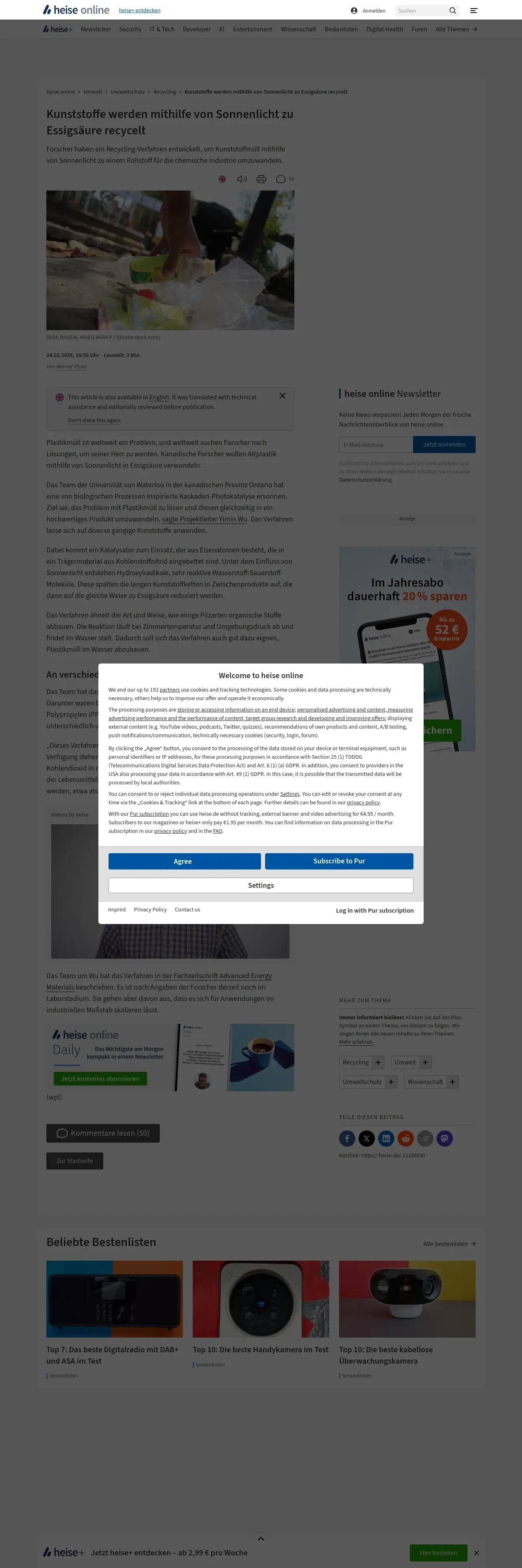 https://www.heise.de:443/news/Kunststoffe-werden-mithilfe-von-Sonnenlicht-zu-Essigsaeure-recycelt-11188030.html