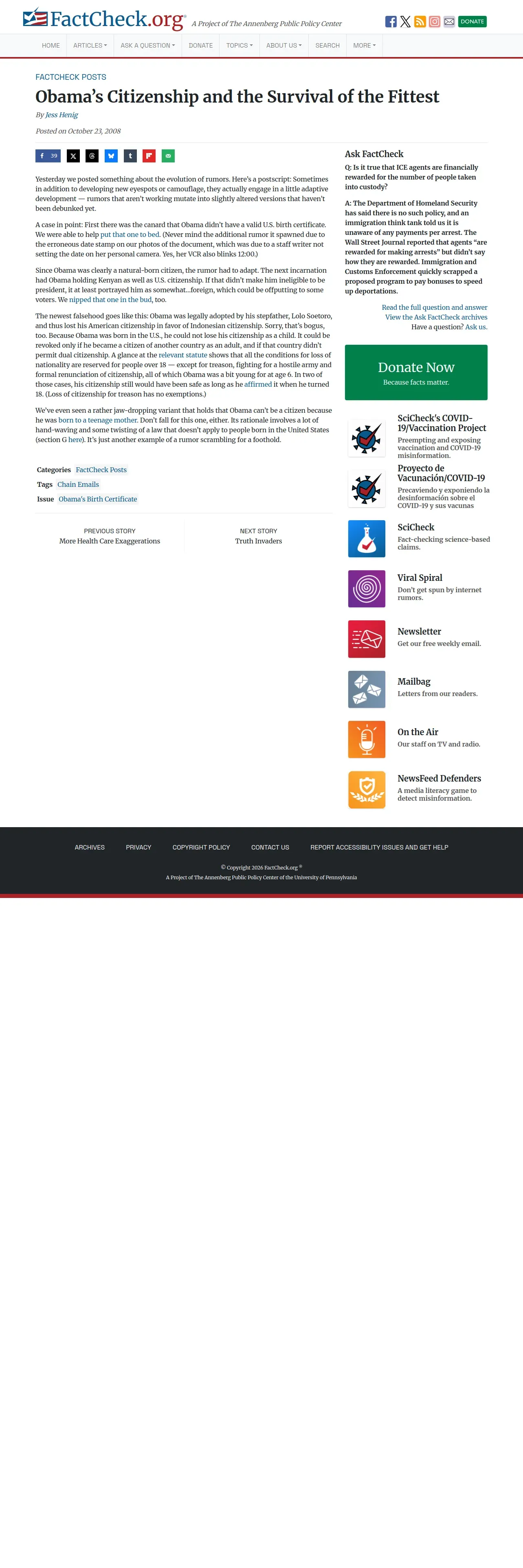 https://www.factcheck.org:443/2008/10/obamas-citizenship-and-the-survival-of-the-fittest/