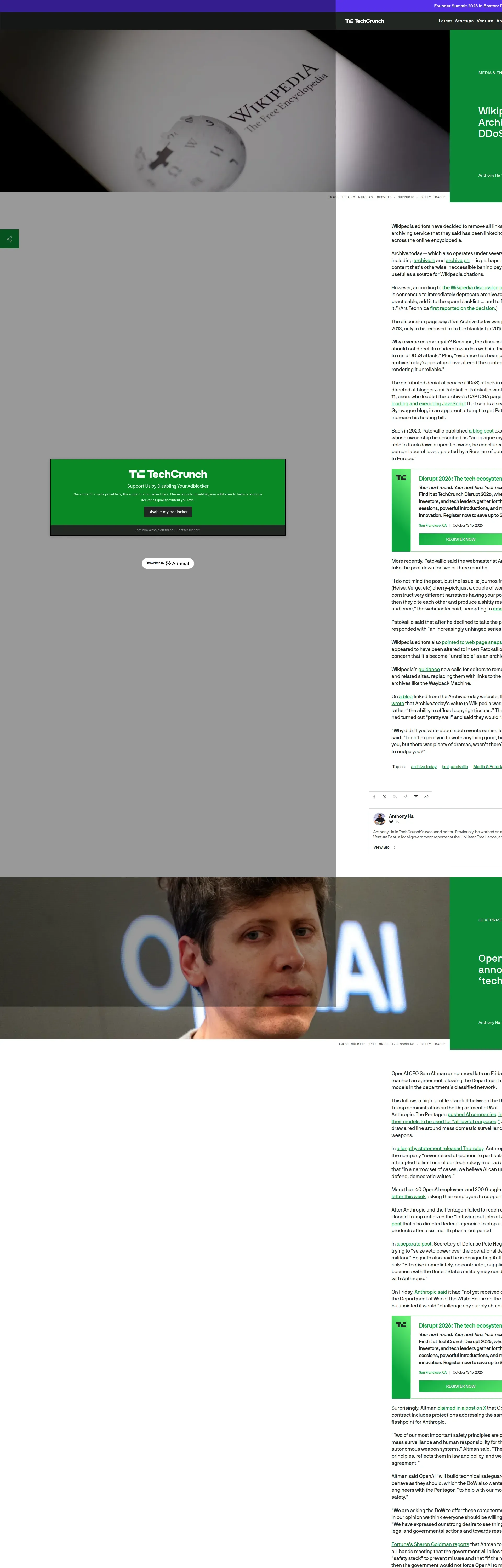 https://techcrunch.com:443/2026/02/21/wikipedia-blacklists-archive-today-after-alleged-ddos-attack/