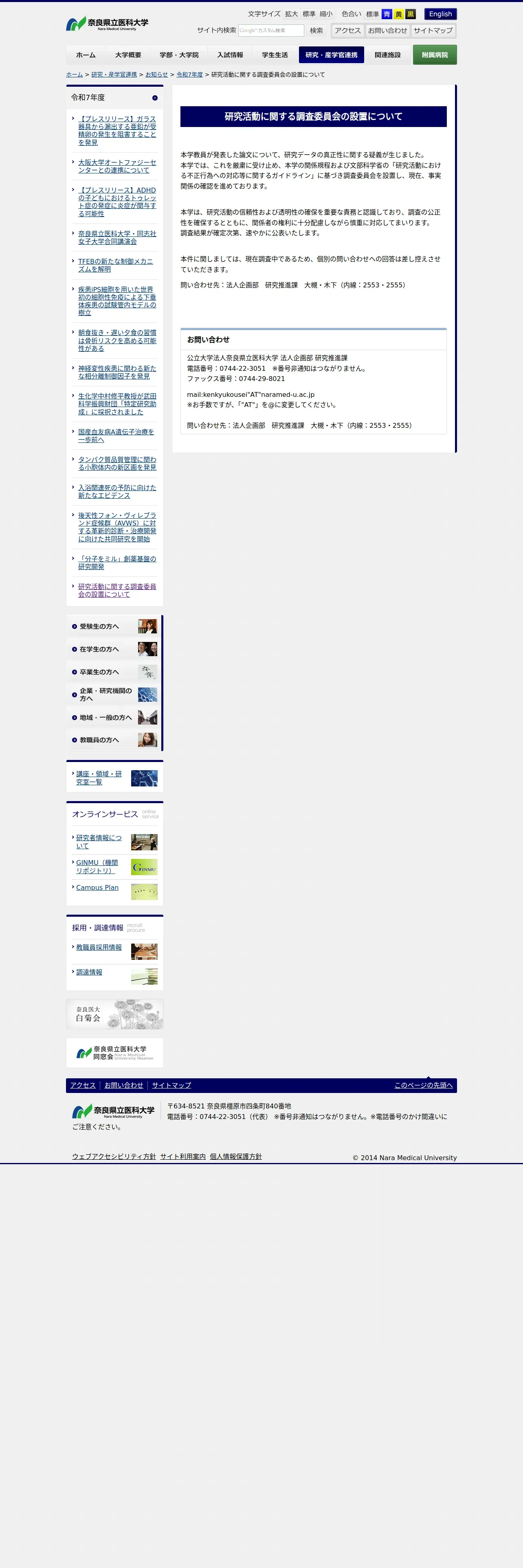 https://www.naramed-u.ac.jp:443/university/kenkyu-sangakukan/oshirase/r7nendo/chousaiinkai.html