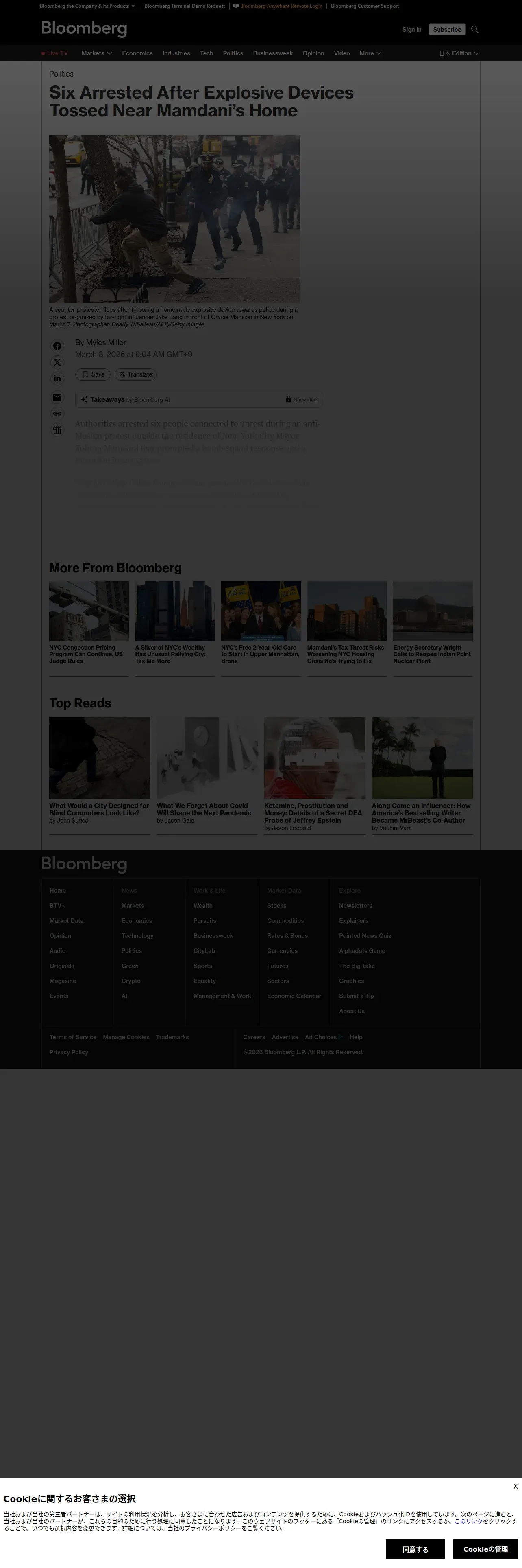 取得元URL: https://www.bloomberg.com:443/news/articles/2026-03-08/six-arrested-after-explosive-devices-tossed-near-nyc-mayor-mamdani-residence