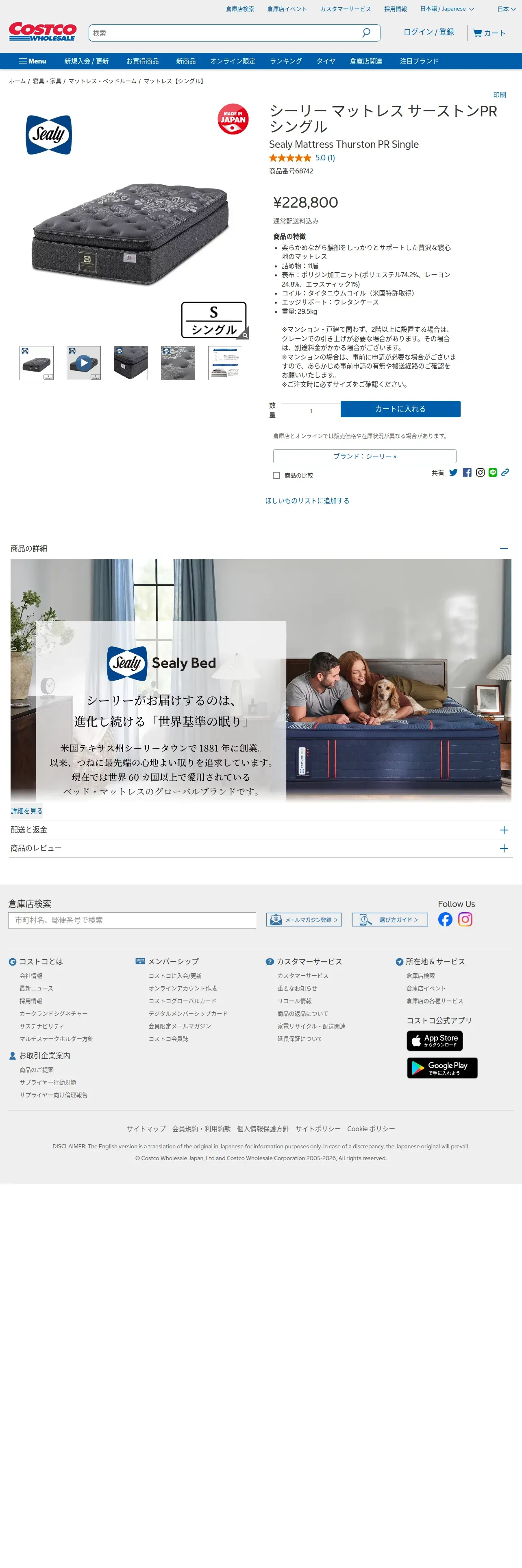 https://www.costco.co.jp:443/c/Sealy-Mattress-Thurston-PR-Single/p/68742