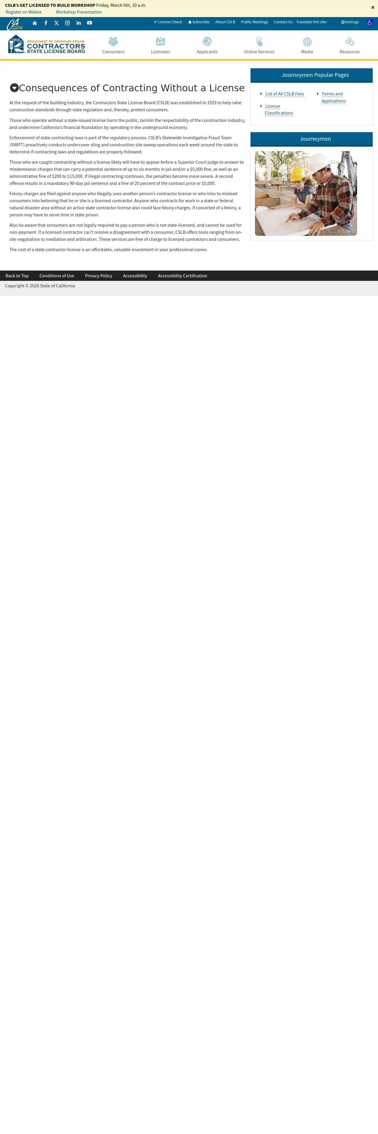 https://www.cslb.ca.gov:443/contractors/journeymen/journeymen_unlicensed_consequences.aspx