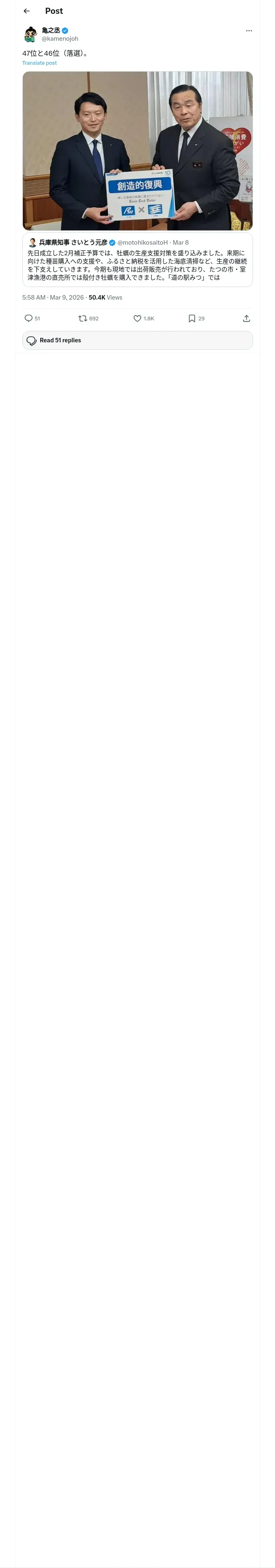 取得元URL: https://x.com:443/kamenojoh/status/2030749958786445400