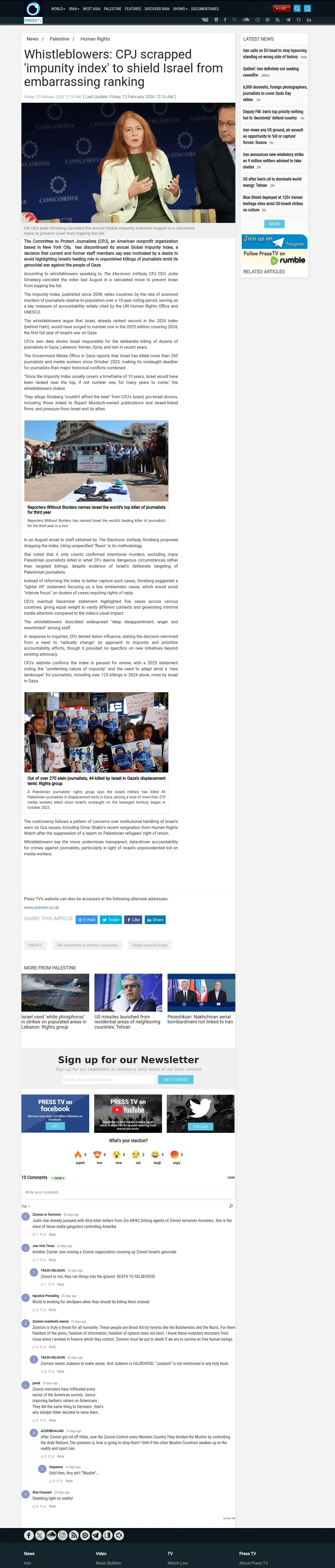 https://www.presstv.ir:443/Detail/2026/02/13/763967/Whistleblowers--CPJ-scrapped--impunity-index--to-shield-Israel-from-embarrassing-ranking