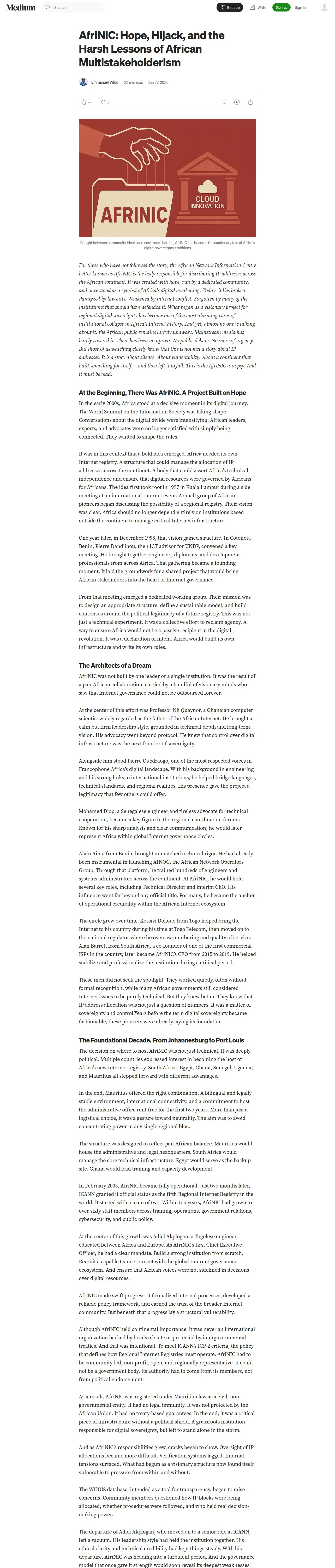 https://medium.com:443/@emmanuelvitus/afrinic-hope-hijack-and-the-harsh-lessons-of-african-multistakeholderism-8e8378797101