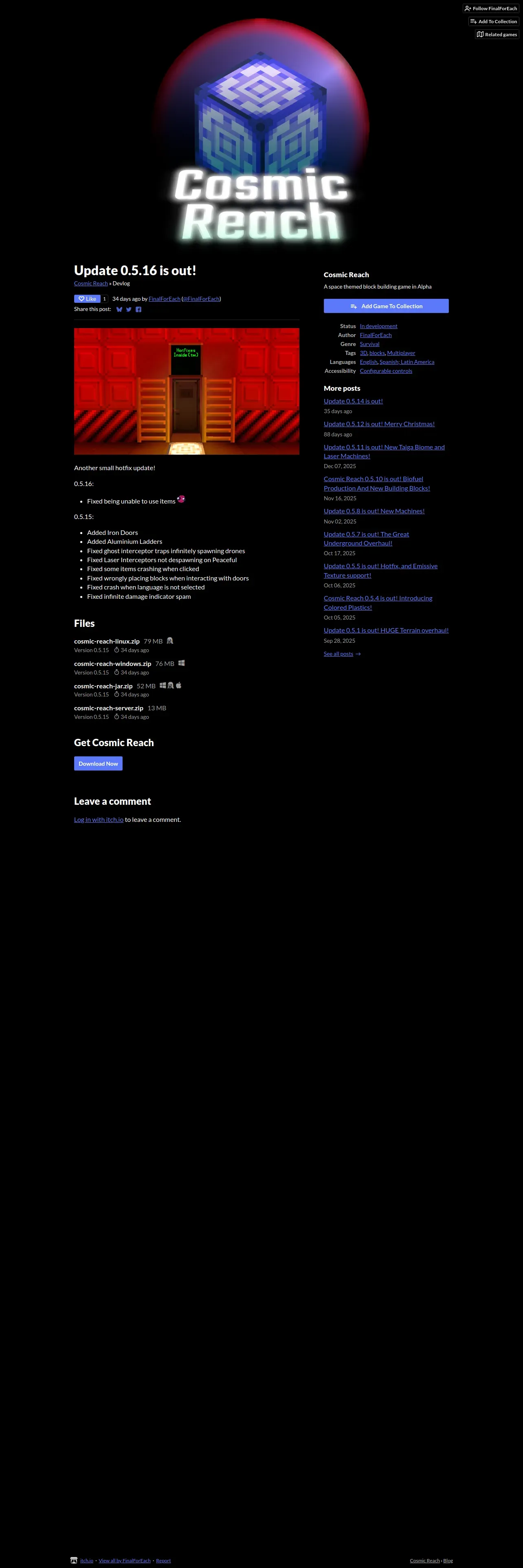 https://finalforeach.itch.io:443/cosmic-reach/devlog/1378031/update-0516-is-out