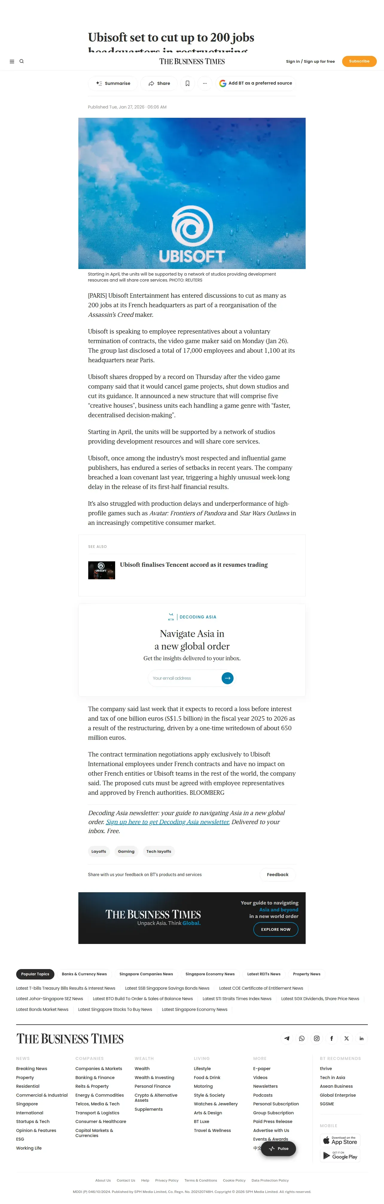 取得元URL: https://www.businesstimes.com.sg:443/companies-markets/ubisoft-set-cut-200-jobs-headquarters-restructuring